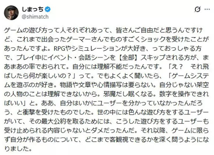 情理是“我玩的是系统,不是故事。看剧情会让我念念寝息。我不睬解臆造变装的厚谊。”