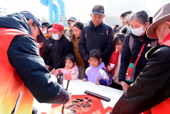 上昼9时,泉城老干部字画联谊会布告长裴政岭、副布告长张国辉,艺术参谋人刘大勇、丁子义、赵玉杰,会员段宝仁、姜瑞虎等老书道家铺纸研墨、笔走龙蛇。“一帆风顺年年好,万事如意步步高”“春满东说念主间欢歌阵阵,福临家世喜气洋洋”……鸿章钜字间,一副副寓意安静的对联、一个个墨韵满盈的“福”字生龙活虎。市民们围拢在书写台前,欢畅地接过这份带着墨香的手写祈福,现场欢声笑语、年味完全。