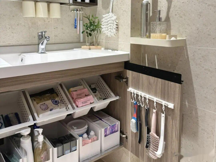 作念法是多种各样,不错在橱柜或者是浴室柜门的内侧,安设收纳架,挂钩或者是收纳袋。