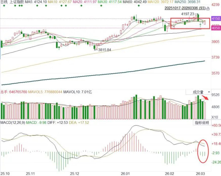 本周上证综指先扬后抑再缩量回升,在4050-4150点箱体下沿取得救助,对4150点箱顶以及4190点前高冲突失败,一是涨速过快时候决议超买,二也长远4150点上方压制较大,强突短线难以站稳;MACD绿柱再现长远作念空动能在缓释中,共事3月4日下跳缺口隔日即回补长远多方反击力量仍不小。科技含量过高的创业板尤其是科创50因权重股阐发欠安跌幅较大,反之油气、化工、银行等权重的走强使上证综指抗跌性更强。