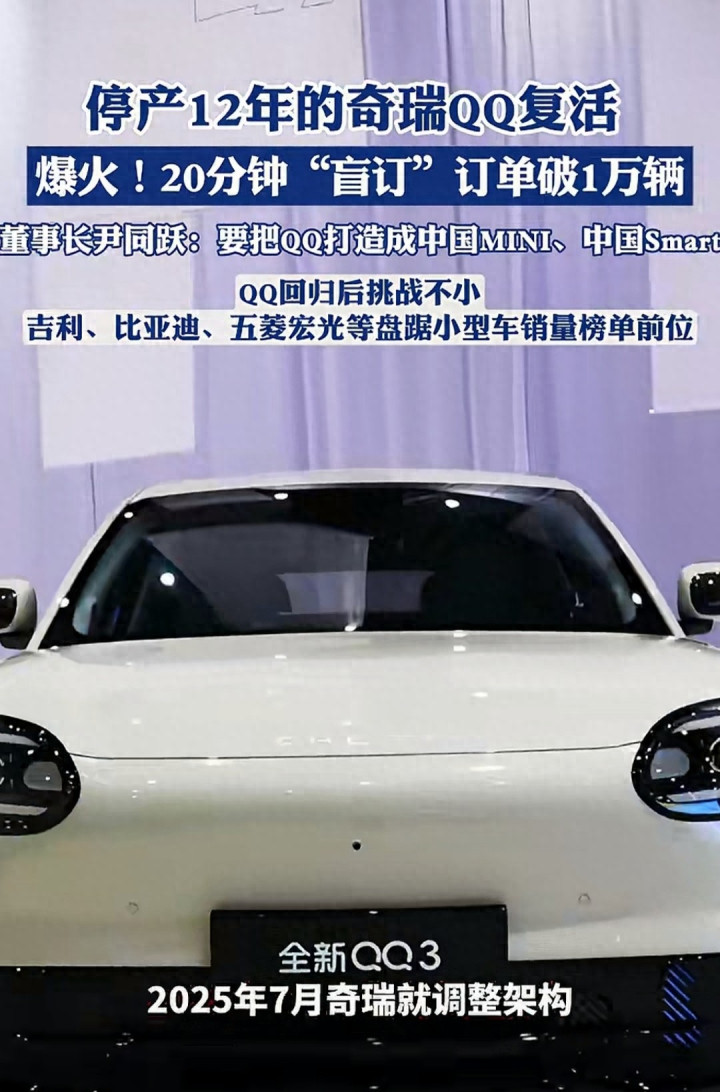 停产12年的奇瑞QQ王者归来,全新纯电QQ3开启盲订仅20分钟,订单就冲破10579台,径直燃烧袖珍车阛阓,网友直呼爷青回!