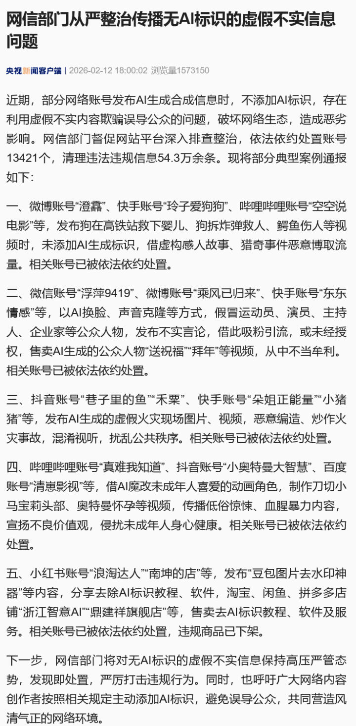 近期,部分收集账号发布AI生成合成信息时,不添加AI象征,存在愚弄舛误虚伪试验诳骗误导公众的问题,碎裂收集生态开云sports,形成恶劣影响。网信部门督促网站平台深化排查整治,照章依约处罚账号13421个,算帐不法违法信息54.3万余条。现将部分典型案例通报如下: