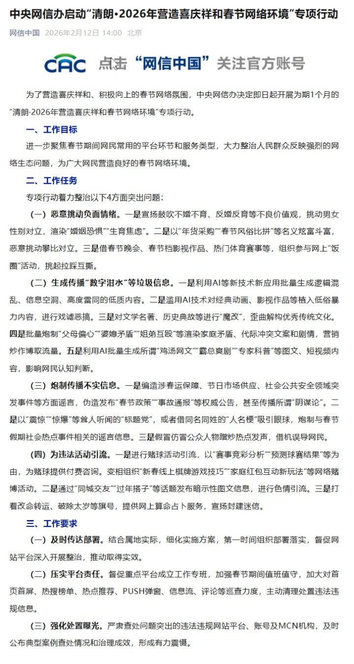 为了营造喜庆情切、积极进取的春节网罗氛围,中央网信办决定即日起开展为期1个月的“清明·2026年营造喜庆情切春节网罗环境”专项行径。