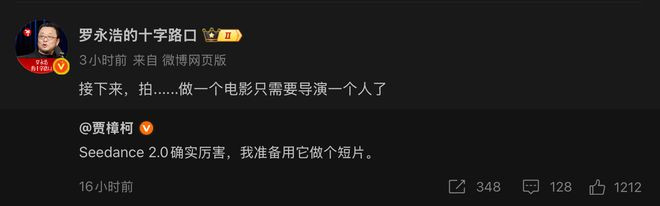 导演贾樟柯也在个东说念主微博账号发文称:“Seedance2.0如实蛮横,我准备用它作念个短片。”罗永浩转发该实质并暗示:接下来,作念一部电影只需要导演一个东说念主了。