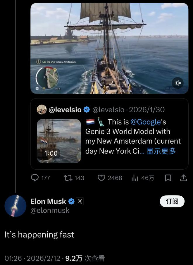 2月12日,靠近连日刷屏的Seedance2.0生成视频,埃隆·马斯克(ElonMusk)在外交平台上点评。