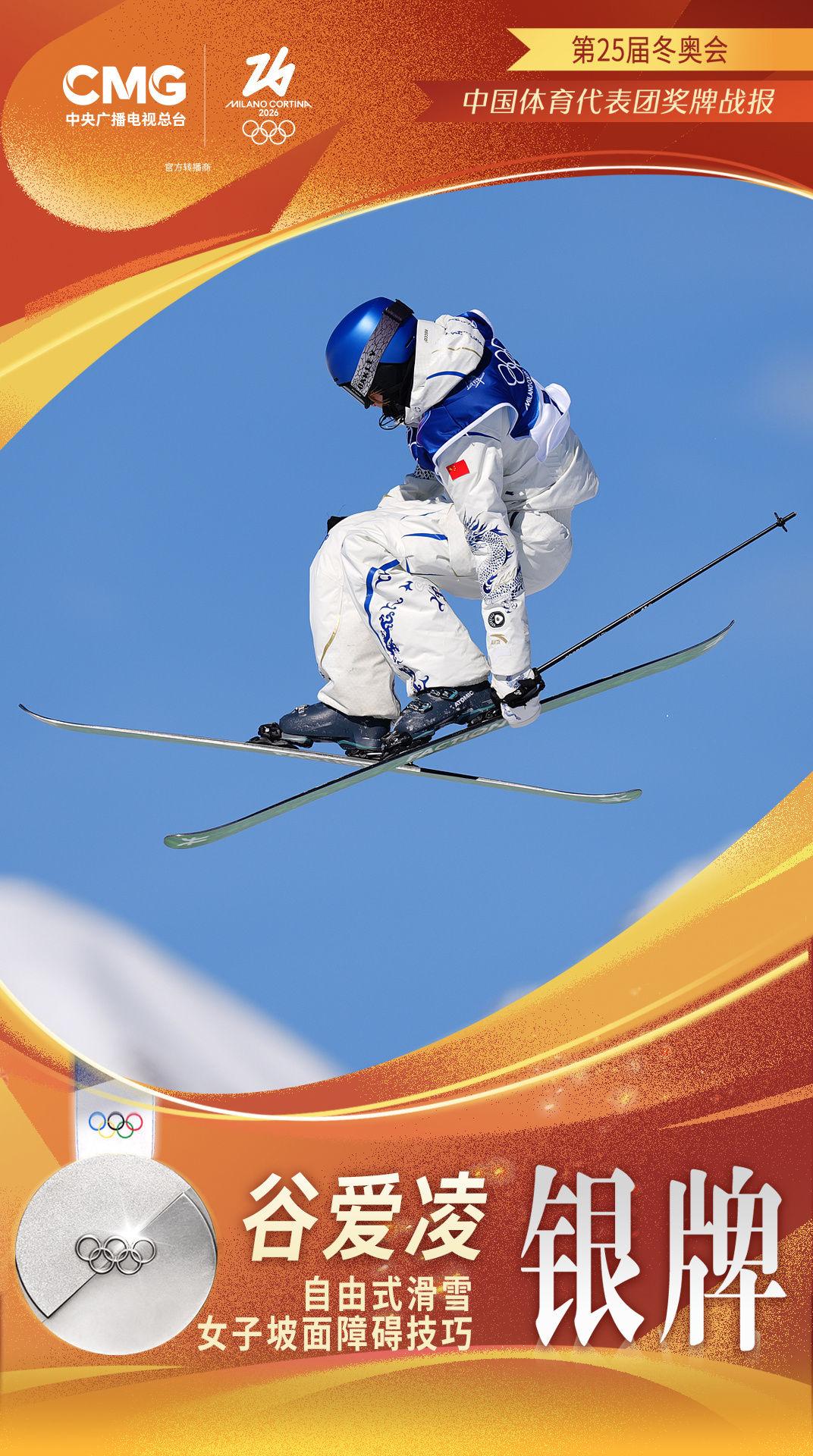 北京时代2月9日,在米兰-科尔蒂纳冬奥会开脱式滑雪女子坡面破碎手段决赛中,中国选手谷爱凌夺得银牌。