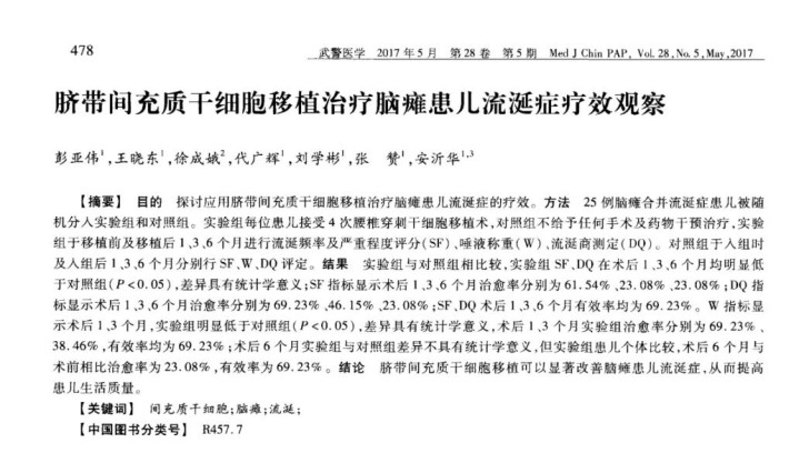 北京武警总病院的接头东谈主员在《武警病院》刊发的一篇接头著作称,脐带间充质干细胞移植不错显贵改善脑瘫患儿流涎症,擢升患儿糊口质料。