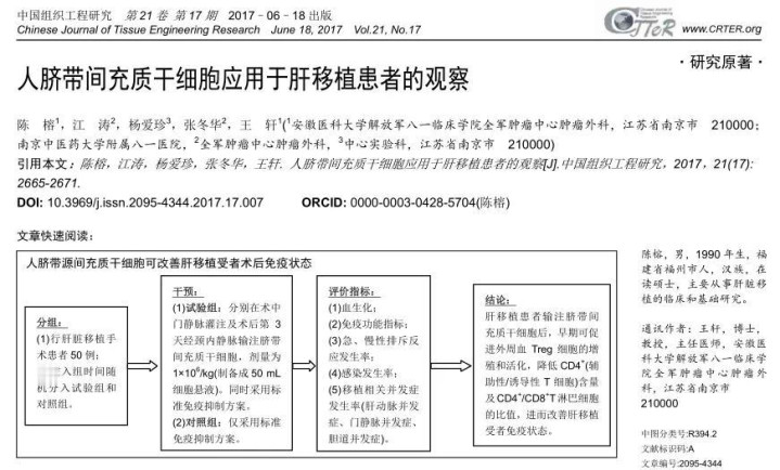 目田军八一病院肝脏移植中心完成了“东谈主脐带间充质干细胞应用于肝移植患者的不雅察”接头,接头规矩败露,肝移植手术后静脉输注脐带间充质干细胞安全可行,可灵验改善肝移植患者的免疫情状。