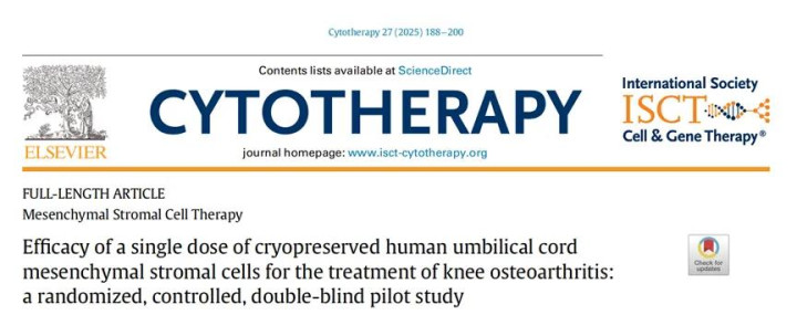 [10]Omar Amado Pico,Francisco Espinoza,María Ignacia Cádiz, et al. Efficacy of a single dose of cryopreserved human umbilical cord mesenchymal stromal cells for the treatment of knee osteoarthritis: a randomized, controlled, double-blind pilot study.. Cytotherapy. 2024;0 (0):0-0.
