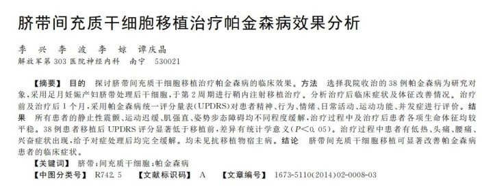 目田军第303病院收治的38例帕金森病患者,汲取足月妊娠产妇脐带处理后干细胞,于第2周期进行鞘内打针移植治疗。
