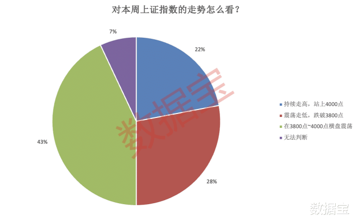 探望数据清楚,43%的受访者以为下周市集将“在3800点~4000点横盘悠扬”,为最主流不雅点;22%的受访者以为下周市集将“握续走高,站上4000点”;28%的受访者以为下周市集将“悠扬走低,跌破3800点”。