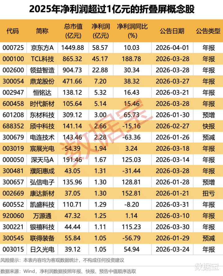据证券时报·数据宝统计,截止4月6日,已有29只折叠屏想法股发布2025年齿迹关联阐述。以年报、事迹快报、事迹预报中值为序取值,19股净利润在1亿元以上。京东方A、TCL科技、领益智造净利润范围均逾10亿元,隔离为58.57亿元、45.17亿元、22.88亿元;鼎龙股份、恒铭达、期间新材净利润均在5亿元以上。