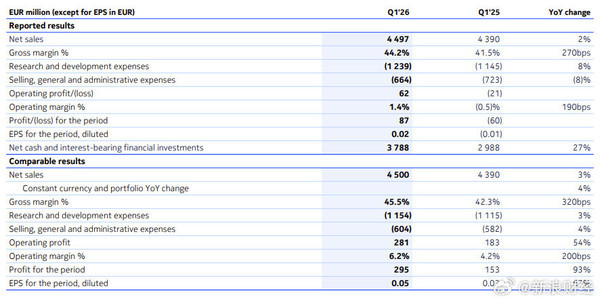 财报暴露,诺基亚2026年第一季度摊薄后每股收益为0.02欧元,退换后每股收益则为0.05欧元,高于分析师预期的0.04欧元。同期,退换后买卖利润为2.81亿欧元,超出商场预期的2.444亿欧元。