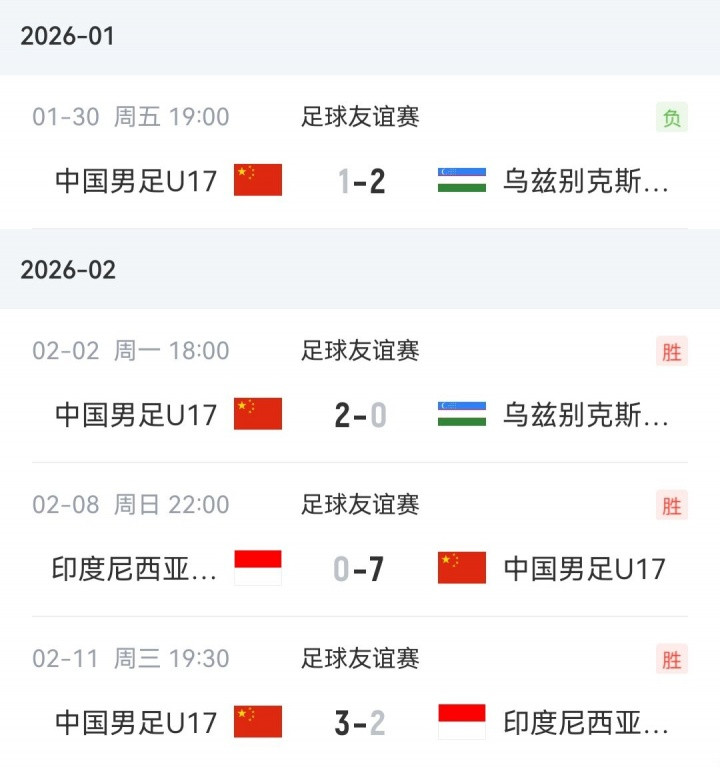 近期U17国足组织了本年的第一期集训,与乌兹别克斯坦U17和印尼U17折柳进行了2场比赛,取得3胜1负的战绩。